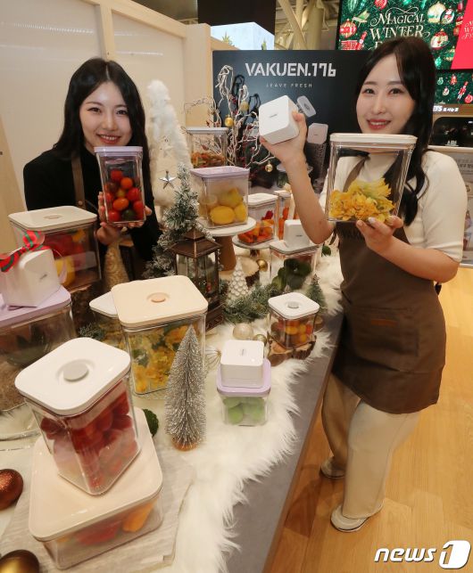 (서울=뉴스1) 박세연 기자 = 6일 서울 강남구 신세계센트럴시티 오픈스테이지에서 열린 진공주방용기 바퀜 브랜드 전시회 ‘타임 오브 바퀜’에서 모델들이 공기를 빼내는 방식의 진공 기술로 최대5배 보관기간을 늘려주는 제품을 선보이고 있다. 이번 브랜드 전시회는 10일까지 진행된다. 2023.12.6/뉴스1