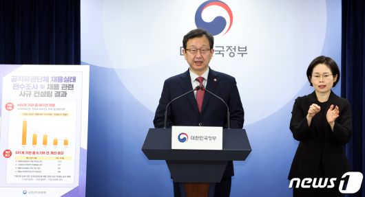 (서울=뉴스1) 김명섭 기자 = 정승윤 국민권익위원회 부위원장 겸 사무처장이 6일 오전 서울 종로구 세종대로 정부서울청사에서 2023년 공직유관단체 채용실태 전수조사 및 사규컨설팅 결과 발표를 하고 있다. 2023.12.6/뉴스1