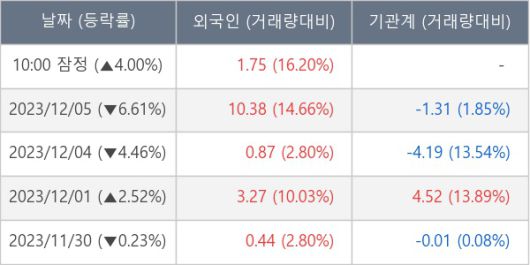 [서울=뉴스핌] 로보뉴스 = 06일 10시 15분 현재 마이크로컨텍솔(098120)은 전일 대비 4.00% (현재가 12,480원) 상승했고, 외국인이 최근 5일 연속 순매수(누적 16.72만 주, 잠정) 행진을 하고 있다.