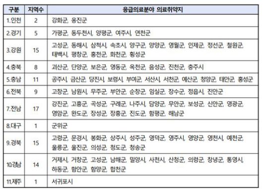응급의료 취약지역이란 '지역응급의료센터로 30분 이내 도달이 불가능하거나, 권역응급의료센터로 1시간 이내 도달 불가능한 인구가 지역 내에서 차지하는 비율이 30% 이상인 시·군·구를 가리킨다. 전국 98개 시·군·구가 여기에 포함된다. 전국 시군구 기준으로 40%에 달하는 지역에서 비대면진료 초진이 가능해지는 셈이다.