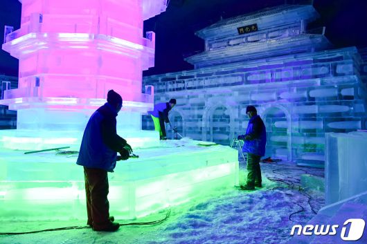 현장에서는 지게차가 얼음을 실어 나르고 건물 2층 높이의 구조물에 오른 기술자들은 얼음조각을 다듬고 자르며 조형물을 깎아내고 있다.