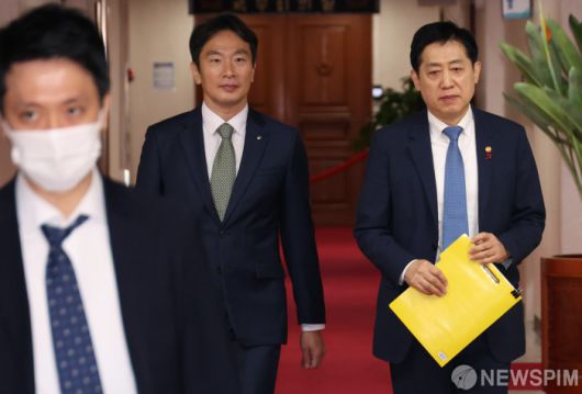 [서울=뉴스핌] 김학선 기자 = 김주현 금융위원장과 이복현 금윰감독원장이 6일 오전 정부서울청사에서 열린 금융위·금감원·보험사 CEO 간담회에 참석하고 있다. 이날 회의는 비공개로 진행됐다. 2023.12.06 yooksa@newspim.com