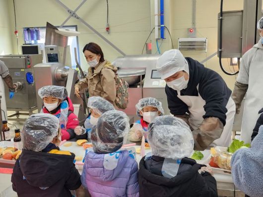 아이들은 돼지고기를 기계로 갈아서 양념 재료를 추가하는 모습을 직접 눈으로 보고 패티 제작용 틀을 이용해 떡갈비 모양을 찍어내는 식품 가공 과정을 체험했다.