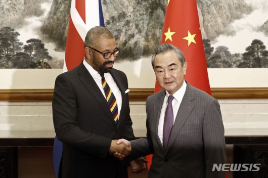[베이징=AP/뉴시스] 제임스 클레벌리 영국 외무부 장관이 30일 중국 베이징에서 왕이 공산당 중앙 정치국 위원 겸 외교부장과 악수하고 있다. 중국을 방문한 클레벌리 장관은 이날 한정 국가부주석, 왕이 외교부장과 회동했다. 2023.08.31 |