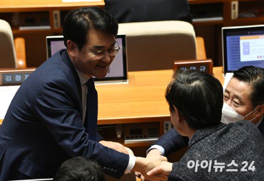 박용진 더불어민주당 의원(왼쪽)이 지난 2월 국회 본회의장에서 하태경 국민의힘 의원과 인사하고 있다. [사진=아이뉴스24DB] |