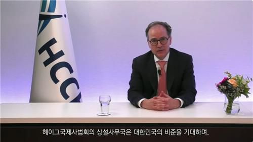영상 축사하는 크리스토프 베르나스코니 헤이그국제사법회의 사무총장 |