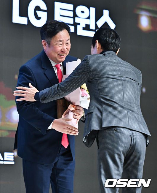 [OSEN=박준형 기자] 4일 오전 서울 강남 엘리에나 호텔에서 조아제약 프로야구대상 2023 시상식이 진행됐다. 프런트상을 수상한 LG 차명석 단장이 염경엽 감독의 축하를 받고 있다. / soul1014@osen.co.kr |