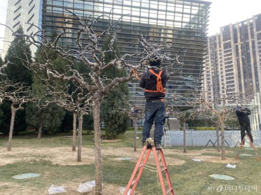 중국 베이징 소재 한 한국기업 중국법인 본사 사옥 앞 정원에 직원들이 연말 조명장식을 설치하고 있다. /사진=우경희 기자 |