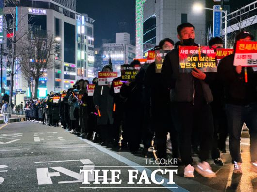 대전 전세사기 대책위가 5일 밤 서구 둔산동 일대에서 거리행진을 하고 있다. / 전세사기 대책위 |