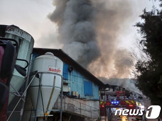 논산 은진면 시묘리 돼지농장 화재 현장 모습. (논산소방서 제공) / 뉴스,1 |