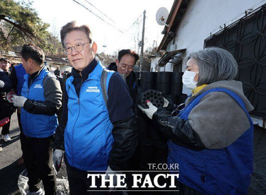 더불어민주당이 6일 저출생 문제 해결을 위해 온동네 초등 돌봄 제도 추진 의사를 밝혔다. 사진 이 대표가 지난 4일 서울 성북구 보국문로 주택가 골목에서 연탄나눔 봉사활동을 하고 있는 장면. /남용희 기자 |