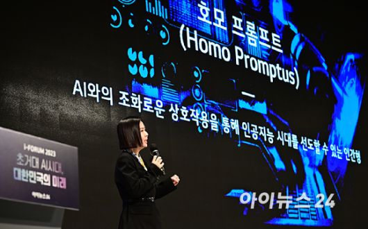 '챗GPT' 등장과 함께 AI 시대가 성큼 다가온 가운데 관련 산업의 현재와 미래를 살펴볼 수 있는 '아이포럼 2023'이 '초거대 AI 시대, 대한민국의 미래'라는 주제로 6일 서울 용산구 드래곤시티 호텔 3층 한라홀에서 열렸다. 이향은 LG전자 생활가전&공조(H&A)사업본부 고객경험(CX) 상무가 강연을 하고 있다. [사진=곽영래 기자] |