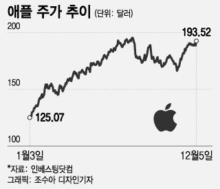 애플 주가는 5일(현지시간) 미국 뉴욕증권거래소에서 전 거래일보다 2.11% 오른 193.42달러에 거래를 마쳤다. 이로써 시총은 3조80억달러(약 3947조6992억원)로 불어났다.