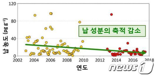 극지연구소 이강현 박사 연구팀은 2017년 그린란드에서 채집한 눈 시료로 북반구 대기에서 배출된 오염물질과 기원지를 추적했다. 2012~2017년에 쌓인 눈의 평균 납 농도는 단위 그램당 10.6 피코그램(pg/g)으로, 이전 연구에서 보고된 2003~2009년보도된 평균, 21.5 피코그램보다 약 49% 줄어든 것으로 확인됐다. 1피코그램(pg)은 1조분의 1그램이다.