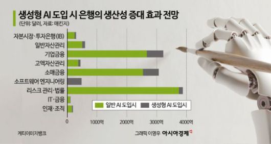 보고서에 따르면 전 세계 은행들은 대규모 데이터를 학습, 분석해 새로운 콘텐츠를 만드는 생성형 AI 도입으로 적게는 연간 2000억달러(약 262조원), 많게는 3400억달러의 생산성 증대 효과를 누릴 것으로 예상됐다. 현재 은행업종 영업이익의 9~15% 수준이다. 앞서 맥킨지는 생성형 AI 도입으로 전 세계에서 연간 2조6000억~4조4000억달러(약 3412조~5774조원)의 경제적 효과가 발생할 것으로 예상했는데, 이 중 은행업이 7.7%의 비중을 차지할 것이라는 새로운 분석 결과를 내놓은 것이다.