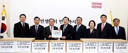중소기업중앙회, 대한전문건설협회, 대한기계설비건설협회, 한국여성경제인협회는 5일 서울 여의도 국회에서 국민의힘 윤재옥 원내대표를 만나 '50인 미만 중대재해처벌법 적용 유예 촉구' 서명운동 결과를 전달하고 유예기간 연장 필요성을 호소했다. /중기중앙회 제공 |