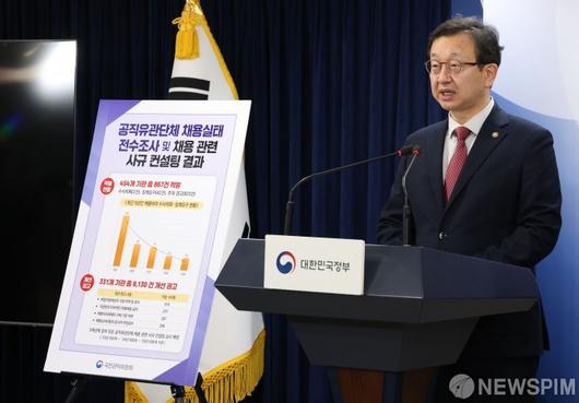 [서울=뉴스핌] 김학선 기자 = 정승윤 국민권익위원회 부위원장이 6일 정부서울청사에서 2023년 공직유관단체 채용실태 전수조사 및 사규컨설팅 결과 발표를 하고 있다. 권익위는 올해 2월부터 10월까지 기획재정부·행정안전부 등 중앙행정기관, 지방자치단체, 교육청과 공동으로 825개 공직유관단체에 대한 채용실태 전수조사를 벌인 결과, 454개 공직유관단체에서 공정채용 위반사례 총 867건을 적발했다. 이와 관련해 채용비리 관련자 68명을 수사의뢰하거나 징계요구했다. 2023.12.06 yooksa@newspim.com