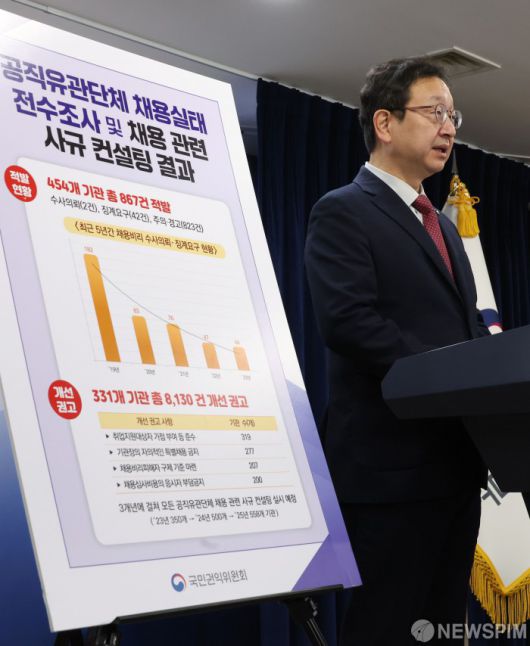 [서울=뉴스핌] 김학선 기자 = 정승윤 국민권익위원회 부위원장이 6일 정부서울청사에서 2023년 공직유관단체 채용실태 전수조사 및 사규컨설팅 결과 발표를 하고 있다. 권익위는 올해 2월부터 10월까지 기획재정부·행정안전부 등 중앙행정기관, 지방자치단체, 교육청과 공동으로 825개 공직유관단체에 대한 채용실태 전수조사를 벌인 결과, 454개 공직유관단체에서 공정채용 위반사례 총 867건을 적발했다. 이와 관련해 채용비리 관련자 68명을 수사의뢰하거나 징계요구했다. 2023.12.06 yooksa@newspim.com