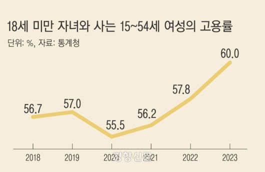 아이가 있는 여성이 일자리를 유지하는 비중은 계속해서 높아지고 있다. 통계청에 따르면 18세 미만 자녀와 함께 사는 15~54세 기혼여성의 고용률은 60.0%로 전년 대비 2.2%포인트 상승해 2016년 통계 작성 이래 역대 최고 수준으로 높아졌다. 자녀 수별 고용률은 1명 61.2%, 2명 59.3%, 3명 이상 56.6%로 자녀 수가 많을수록 고용률이 낮아졌다.