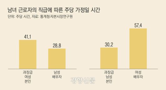 지난해 통계청 조사 결과 전 직급에서 남성 근로자는 돌봄과 집안일을 하는 시간이 아내의 절반 수준에 그쳤다. 과장급 남성 근로자는 가정일에 주당 30.2시간을 쓰고 여성 배우자는 2배에 가까운 57.4시간을 집안일과 돌봄에 썼다. 반면 과장급 여성 근로자는 본인이 41.4시간을 돌봄과 집안일에 쓰고, 남성 배우자는 28.8시간을 쓰는 데 그쳐 남편보다 더 많은 집안일을 소화했다. 강소현 자본시장연구원 연구위원은 “돌봄 및 집안일이 남녀 간 균등하게 분담되고 있다고 보기 어렵다”면서 “임원급까지 경력을 쌓아 업무적 성공을 거둔 여성도 마찬가지”라고 밝혔다. 강 연구위원은 “출산과 돌봄으로 인해 포기하는 대가가 커질수록 여성의 출산 결정에 부정적인 영향을 미쳐 저출생 문제를 더욱 악화시킬 가능성이 있다”고 했다.