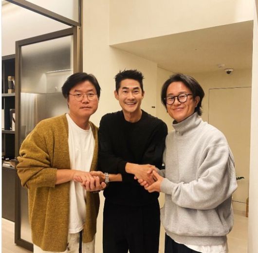 공개된 사진 속 배정남은 나영석 PD, 김대주 작가와 다정하게 손을 잡고 있는 모습이다.