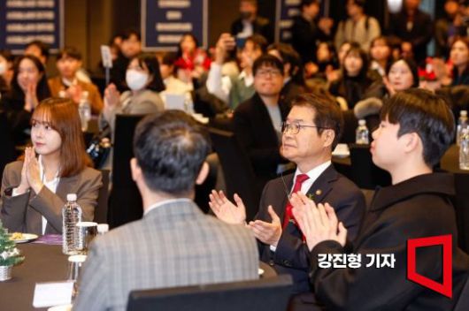 이정식 고용노동부 장관이 6일 서울 종로구 JW메리어트 동대문에서 열린 '2023 미래내일 일경험 콘퍼런스'에서 일경험 공모전 수상 청년들과 박수치고 있다. <ⓒ투자가를 위한 경제콘텐츠 플랫폼, 아시아경제(www.asiae.co.kr) 무단전재 배포금지>