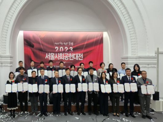 지난 5일 서울시청 태평홀에서 열린 '2023 서울사회공헌대전'에서 김정환 힘펠 대표(윗줄 왼쪽 첫 번째)와 참석자들이 기념 사진을 촬영하고 있다./제공=힘펠 |
