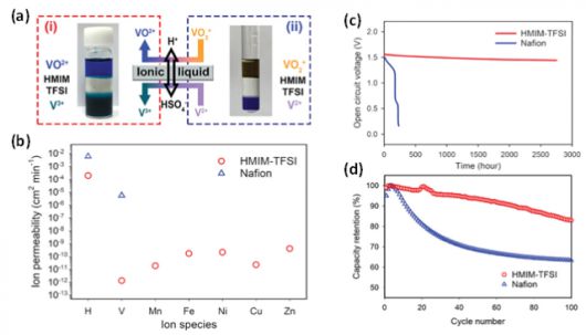 연구팀은 바나듐의 투과성은 낮추면서도 이온 전도도와 전기화학적 안정성을 높일 수 있는 분리막 소재로 ‘이온성 액체’를 사용했다. 이온성 액체를 다공성 고분자막에 넣은 후 막 표면을 나피온으로 박막 코팅 처리하는 방법으로 분리막을 제조했다. 해당 분리막을 탑재한 VRFB는 기존 대비 자연 방전 시간이 14배가량 늘어난 것으로 나타났다.