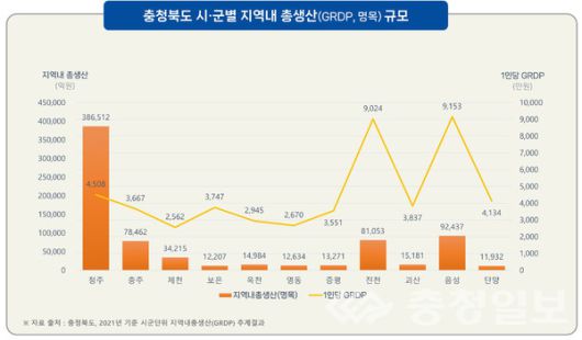 충북도가 지난 1일 공표한 지난 2021년 기준 '충청북도 시·군단위 지역내총생산(GRDP)' 추계결과, 음성군의 1인당 GRDP는 2020년보다 1079만원 증가한 9153만원으로 나타났으며 충북도내 평균 4612만원보다 무려 4541만원(98.5%)이 많은 수치이다.