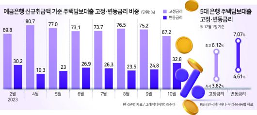 ▶주담대 변동금리 비중 ‘올해 최대’...특례고정도 3.9조 줄어=6일 한국은행에 따르면 지난 10월 은행권에서 취급한 주택담보대출 중 고정금리 대출의 비중은 67.2%로 전달(75.2%)과 비교해 8%포인트 감소한 것으로 집계됐다. 같은 기간 변동금리 대출 비중은 24.8%에서 32.8%로 늘어, 지난해 11월(35%) 이후 약 1년 만에 가장 높은 수치를 기록했다. 변동금리 대출 비중은 올해 3월 이후 줄곧 10~20%대를 유지한 바 있다.