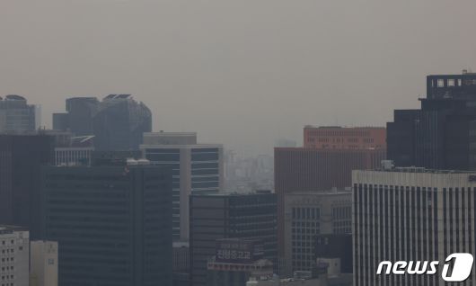 (서울=뉴스1) 허경 기자 = 전국 대부분 지역에 초미세먼지 농도가 '나쁨' 수준을 보인 6일 서울 중구 롯데호텔에서 바라본 도심 일대가 뿌옇다.. 2023.12.6/뉴스1