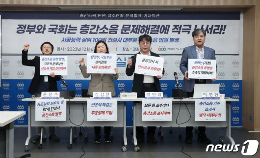 (서울=뉴스1) 이승배 기자 = 경제정의실천시민연합(경실련) 구성원들이 6일 오전 서울 종로구 경실련에서 열린 층간소음 민원 접수현황 분석발표 기자회견에서 층간소음 대책마련을 촉구하고 있다. 경실련은 이날 기자회견에서 최근 3년간 층간소음 피해자들의 민원 실태를 분석한 결과 시공능력 상위 100위 건설사 중 13개를 제외한 87개사(87%)에서 민원이 발생한 것으로 나타났다고 밝혔다. 이에 정부와 국회의 층간소음 문제해결에 적극 나설 것을 촉구했다. 2023.12.6/뉴스1