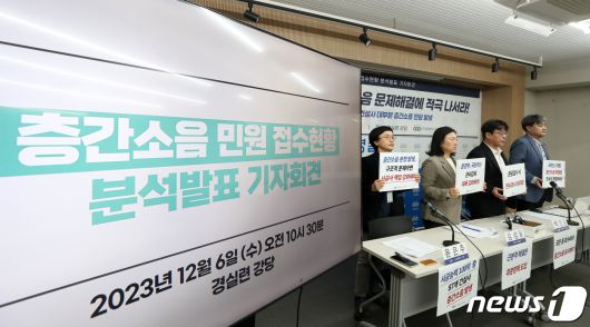 (서울=뉴스1) 이승배 기자 = 경제정의실천시민연합(경실련) 구성원들이 6일 오전 서울 종로구 경실련에서 열린 층간소음 민원 접수현황 분석발표 기자회견에서 층간소음 대책마련을 촉구하고 있다. 경실련은 이날 기자회견에서 최근 3년간 층간소음 피해자들의 민원 실태를 분석한 결과 시공능력 상위 100위 건설사 중 13개를 제외한 87개사(87%)에서 민원이 발생한 것으로 나타났다고 밝혔다. 이에 정부와 국회의 층간소음 문제해결에 적극 나설 것을 촉구했다. 2023.12.6/뉴스1