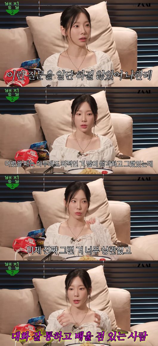 태연은 "어릴 때는 아무래도 외적인 걸 많이 생각하고 보여지는 걸 생각했다. 이제 그런 거 상관 없고 대화 잘 통하고 배울 점 많은 사람이 좋다. 그럼 내가 최선을 다한다"고 솔직히 이야기했다.
