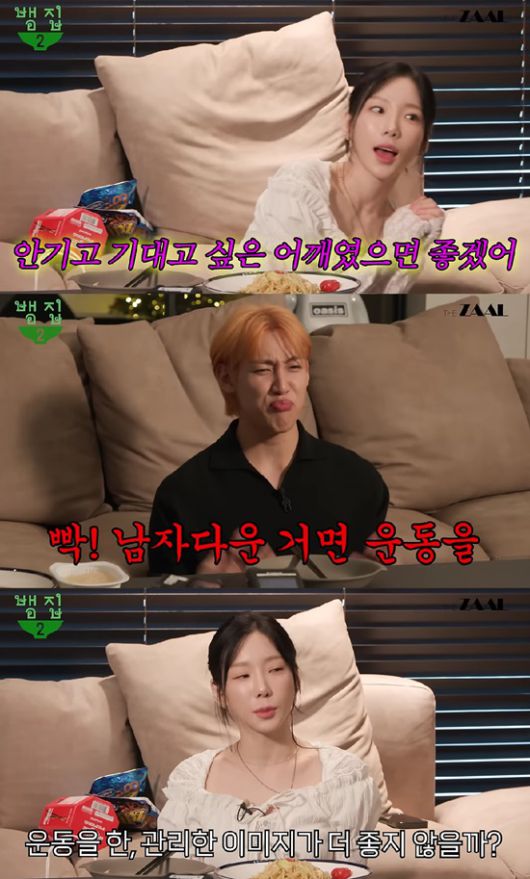 뱀뱀은 "그럼 외적으로 절대 포기가 안 되는 게 있냐"고 물었고 태연은 "어깨다"라며 "내가 안기고 기대고 싶은 어깨였으면 좋겠다"고 답하며 웃음을 터트렸다.