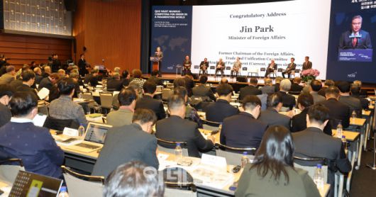 [이데일리 방인권 기자] 박진 외교부 장관이 6일 서울 중구 대한상공회의소에서 '세계, 어디로 가고 있는가: 파편화된 세계 속 질서를 위한 경쟁'을 주제로 열린 2023 NEAR 글로벌 서베이 보고서 발표 국제콘퍼런스에서 축사를 하고 있다.