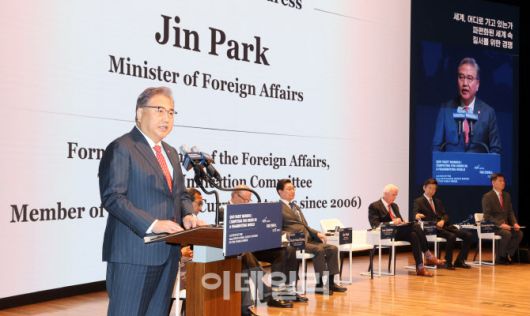 [포토]2023 NEAR 글로벌 서베이 보고서 발표 국제콘퍼런스에서 축사하는 박진 장관