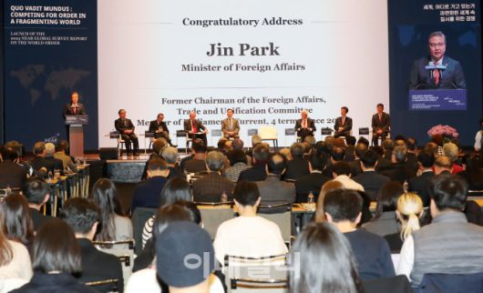 [이데일리 방인권 기자] 박진 외교부 장관이 6일 서울 중구 대한상공회의소에서 '세계, 어디로 가고 있는가: 파편화된 세계 속 질서를 위한 경쟁'을 주제로 열린 2023 NEAR 글로벌 서베이 보고서 발표 국제콘퍼런스에서 축사를 하고 있다.