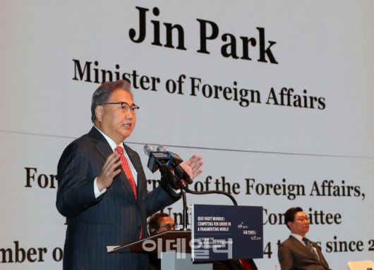[이데일리 방인권 기자] 박진 외교부 장관이 6일 서울 중구 대한상공회의소에서 '세계, 어디로 가고 있는가: 파편화된 세계 속 질서를 위한 경쟁'을 주제로 열린 2023 NEAR 글로벌 서베이 보고서 발표 국제콘퍼런스에서 축사를 하고 있다.