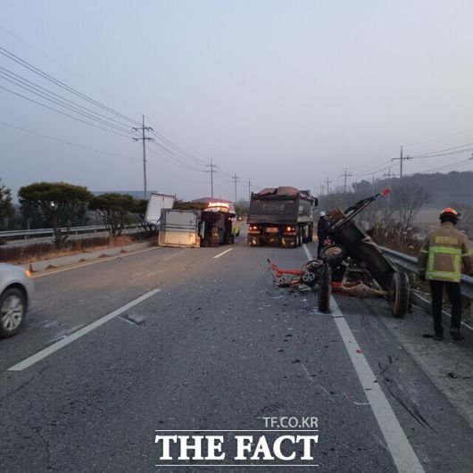 화물차 운전자 A 씨와 경운기 동승자인 B 씨의 아내는 경상을 입고 병원으로 옮겨져 치료 중이다.