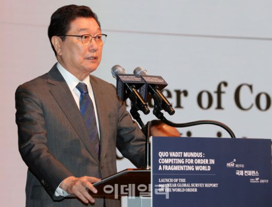 [이데일리 방인권 기자] 정덕구 니어재단 이사장이 6일 서울 중구 대한상공회의소에서 '세계, 어디로 가고 있는가: 파편화된 세계 속 질서를 위한 경쟁'을 주제로 열린 2023 NEAR 글로벌 서베이 보고서 발표 국제콘퍼런스에서 개회사를 하고 있다.