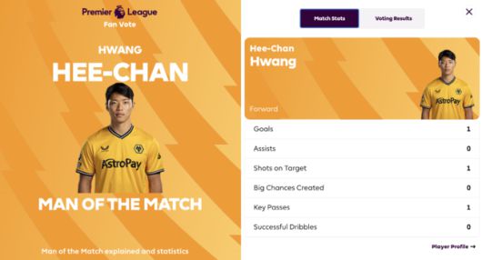 공식 MOM(Man of the match)도 당연히 황희찬의 몫이었다. 경기 후 PL 홈페이지는 그가 팬 투표에서 무려 83.5%의 득표율을 기록하며 압도적으로 1위를 차지했다고 밝혔다. 2위에 오른 울버햄튼 수문장 벤틀리(6.4%)를 약 80% 차이로 크게 따돌렸다.