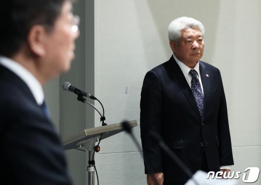 (서울=뉴스1) 오대일 기자 = 김홍일 방송통신위원장 후보자가 6일 용산 대통령실 청사 브리핑룸에서 열린 김대기 비서실장의 인선 발표 브리핑을 경청하고 있다. 2023.12.6/뉴스1