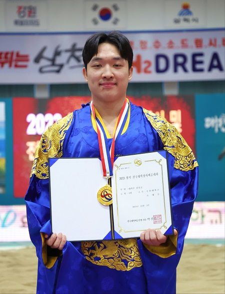 [괴산=뉴스핌] 백운학 기자 =중원대 조대승이 3~ 5일까지 삼척체육관에서 열린 전국대학장사씨름대회에서 개인전 경장급(75kg 이하) 정상에 올랐다.