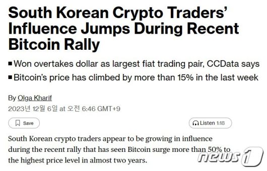 블룸버그는 암호화폐(가상화폐) 관련 데이터 제공업체인 CC데이터를 인용, 최근 비트코인 거래에 사용된 법정통화 비중에서 한국 원화는 41%로, 미국 달러(40%)를 추월해 1위를 기록했다고 전했다.