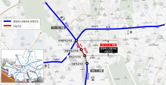 오는 9일 서울 서대문구 염천교사거리~서대문역교차로(빨간선) 0.8㎞ 구간에 중앙버스전용차로가 개통한다. 서울시 제공 |