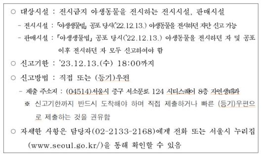 서울시 내 전시금지 야생동물을 전시하는 전시시설(야생동물 카페 등 전시시설, 야생동물 이동전시업, 공원 등 시설에 포함된 소규모 전시시설, 야생동물샵 등 판매시설)은 신고서 및 제출서류를 구비해 서울시 자연생태과로 제출하면 된다.