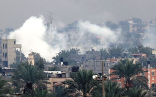 5일(현지시간) 이스라엘과 팔레스타인 무장정파 하마스 간의 전투가 계속되는 가운데 가자지구 남부 최대도시인 칸유니스의 건물 위로 연기가 피어오르고 있다. [AFP] |