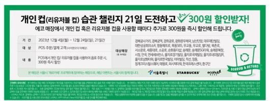 | 서울 시 내 스타벅스 에코매장 36곳에서 진행되는 '도전! 개인 컵 사용 21일' 행사 안내. / 사진=서울시 |