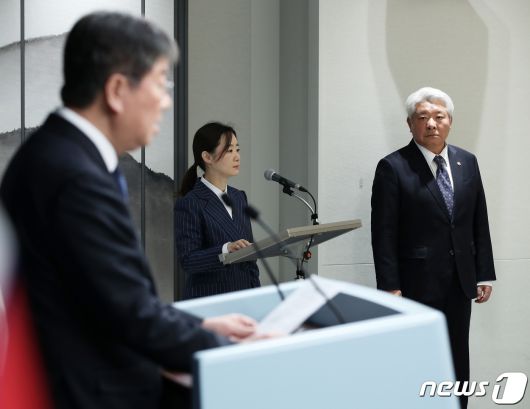 (서울=뉴스1) 오대일 기자 = 김홍일 방송통신위원장 후보자가 6일 용산 대통령실 청사 브리핑룸에서 열린 김대기 비서실장의 인선 발표 브리핑을 경청하고 있다. 2023.12.6/뉴스1